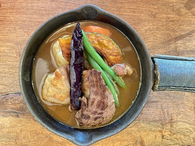 それもそのはず、調べてみると小麦粉を一切使用していないのでサラサラのカレーになっていて北海道のスープカレーとは全くの別物。さらにコクを生み出しているのは14種ものスパイスを使ったインド料理をベースに秘伝の出汁を加えて丸2日煮込み、さらに2日間寝かせる(冬眠と呼んでいるそう)ことで独特のまろみと旨みが現れるのだそう。