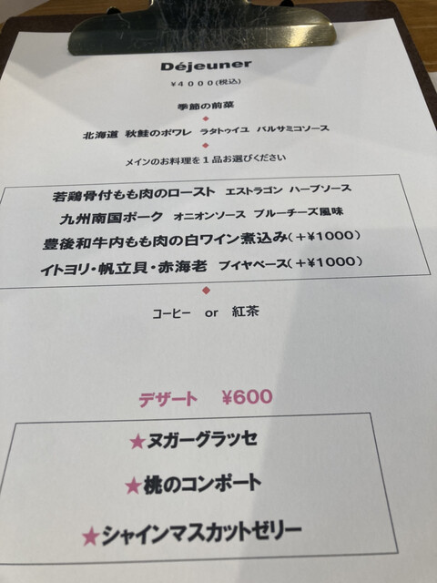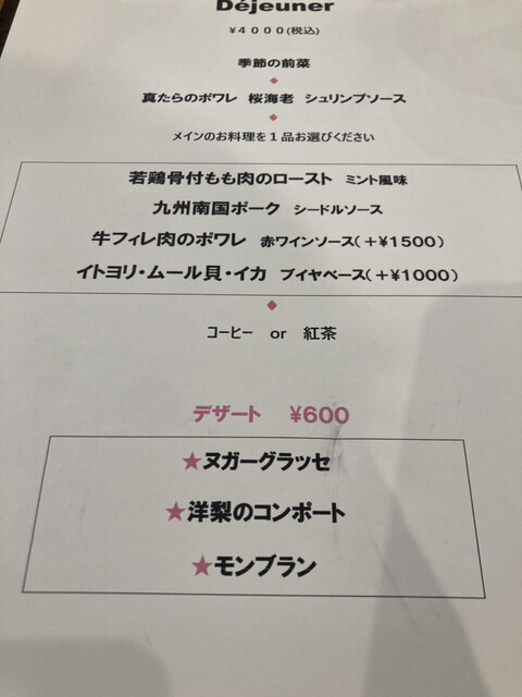 ランチはコースで、アミューズ、前菜、魚、メイン料理で、追加でデザートも選べます。