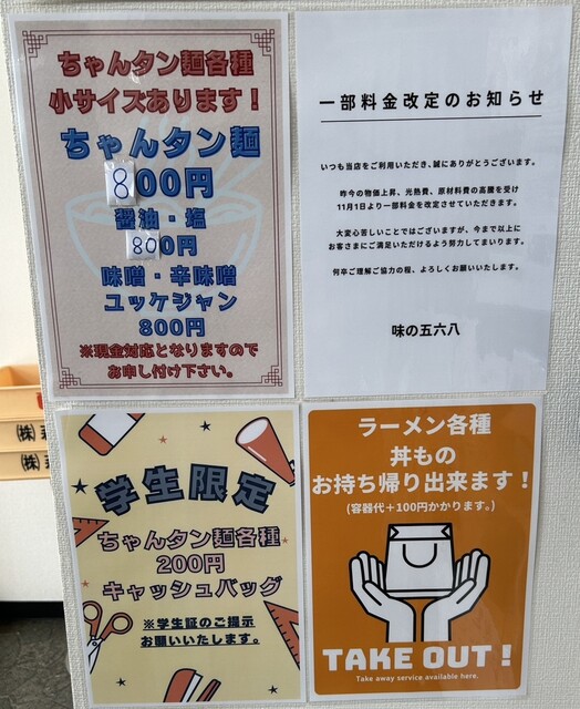 4月からはリフレッシュオープンに伴い五六八の日(ちゃんタン麺600円)は終了し、若干のメニューの見直しと営業時間も少し変わるみたいです。