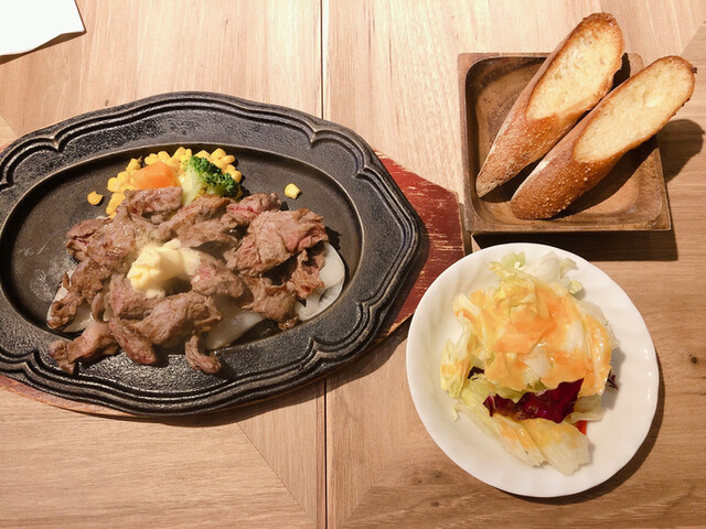 この中から、オススメと書いてあったガーリックステーキとランチカットステーキ200gとパン・ライスを発注。