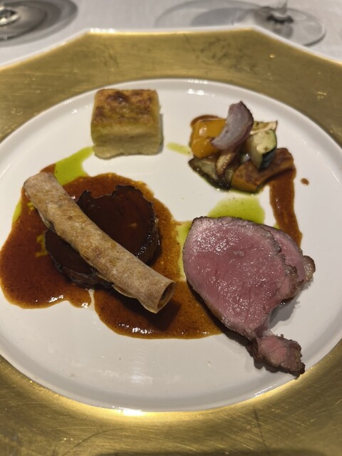 フランス産子羊ロースとバラ肉のロールドライフルーツとアフリカンスパイスの春巻きをのせて。大原の焼き野菜、ポレンタ