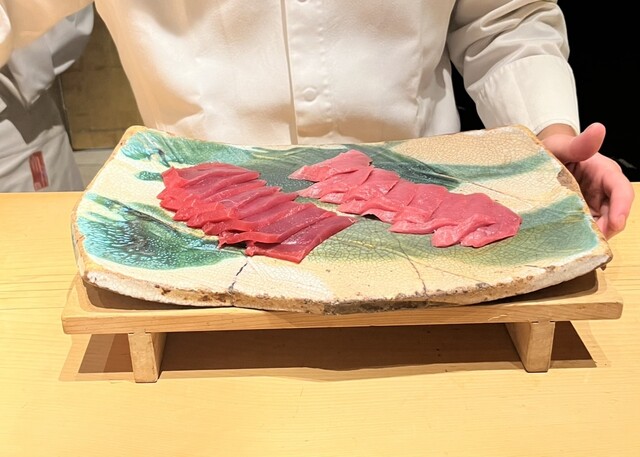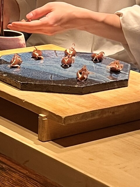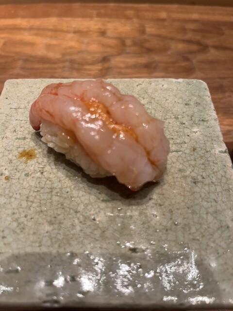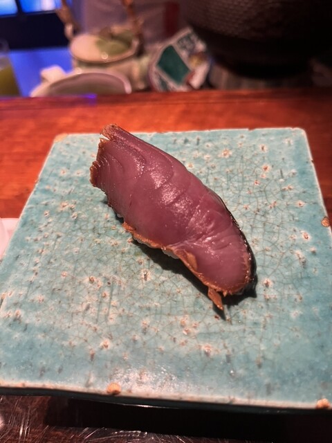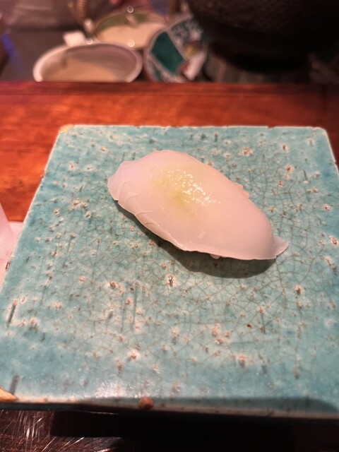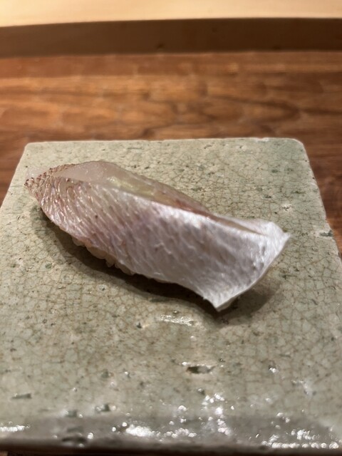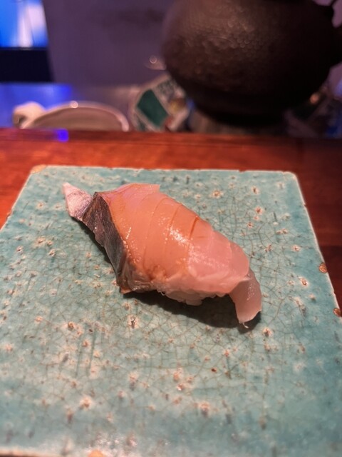 前回気がつきませんでしたがカウンターに置かれたお鮨、写真を撮る際に影が出ないんです。そうなるようにライティングの設定にも配慮しているそうです。以前の大将だは考えられない事だそうですが、、最近は考え方を変えられたそうです。さすが最近の作り手も考え方が進化しています。