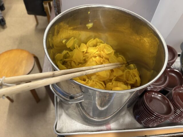更に、ただでさえ安いラーメン店ですが、驚くことに、ラーメンを注文したお客様には、お惣菜取り放題の無料サービスが付いています。大抵、たくあんと高菜の漬物があり、それ以外に2種類ほどのお惣菜が店内の中央に用意されており、小皿に自由に取ることができます。コストパフォーマンス最高です。