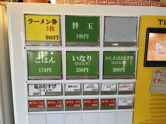 お店に入ってすぐの食券機で豚骨ラーメンとご飯の食券を買います。奥に進むと、並んでいる場合は列に並んで店員さんの指示で着席、並んでない場合は何となく自分の判断で着席します。店員さんは順次テーブルの上の食券を確認しに来ますので、わざわざ店員さんを呼ぶ必要はありません。