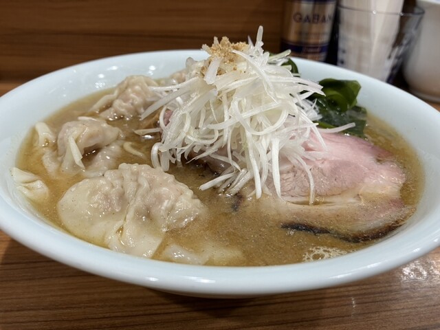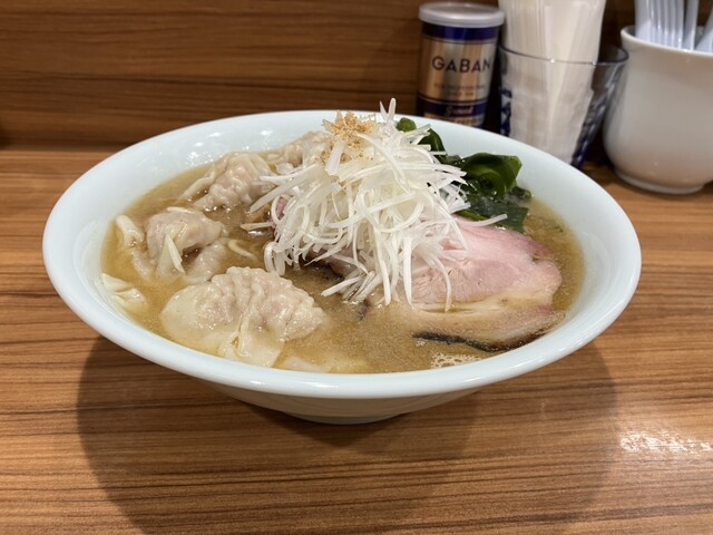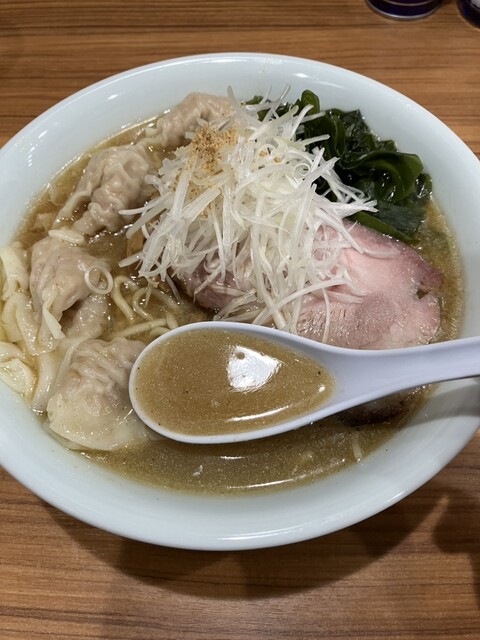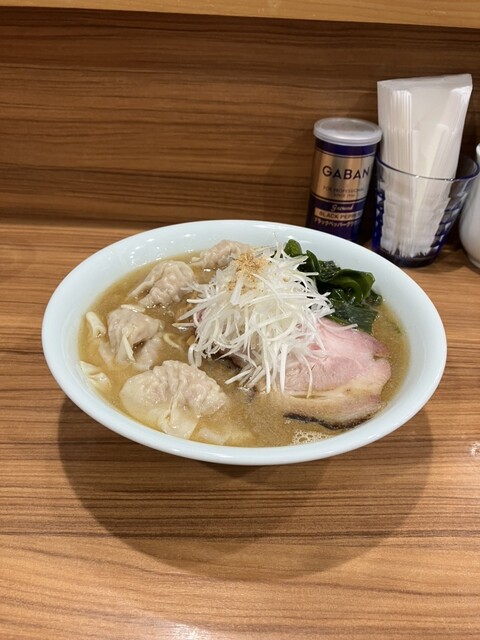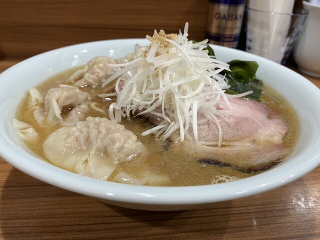 具材は、チャーシュー、ワンタン、メンマ、ワカメ、白髪ネギのラインナップ。