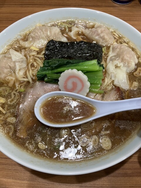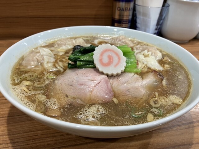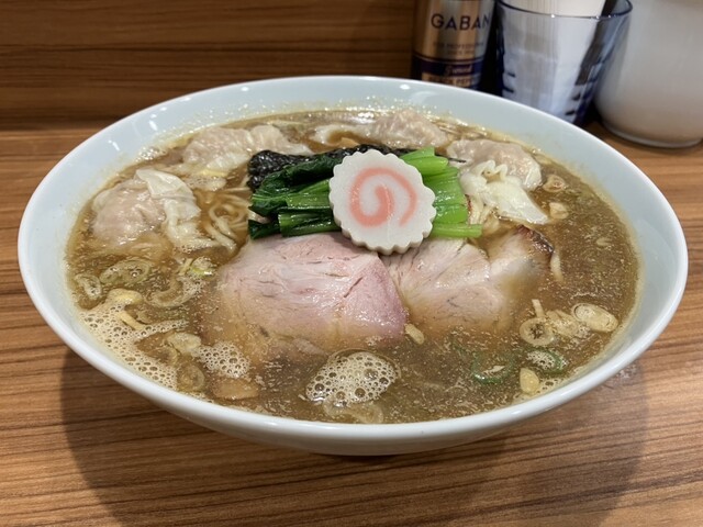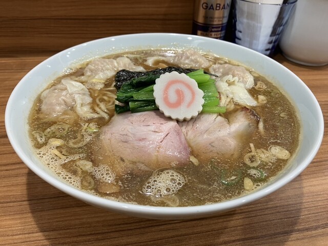 具材は、チャーシュー、ワンタン、メンマ、小松菜、ナルト、海苔、ネギのラインナップ。