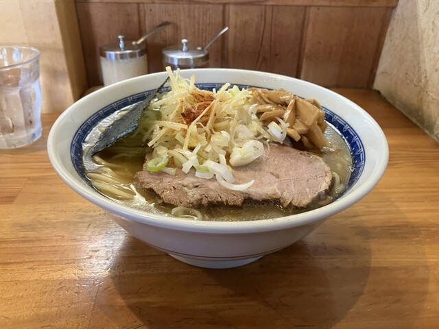 具材は、チャーシュー、メンマ、海苔、針生姜、刻みネギのラインナップ。
