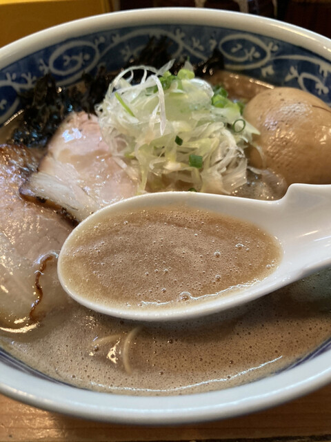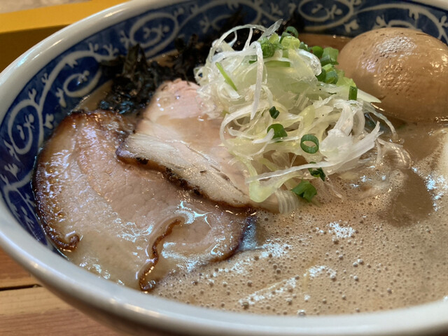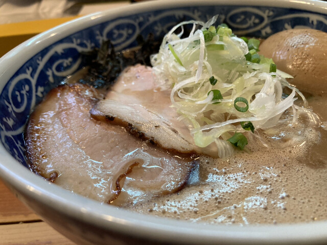 そしてスープは、粘土高めで泡立ちを放つピュア豚骨スープ。そこに、全粒粉入りの自家製中細ストレート麺を合わせていただくスタイルどす。