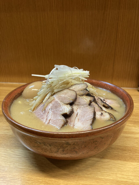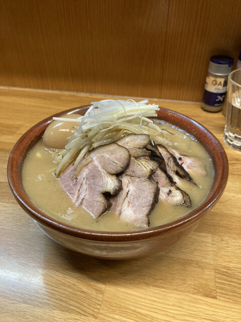 具材はチャーシュー、味玉、モヤシ、メンマ、白髪ネギのラインナップ。