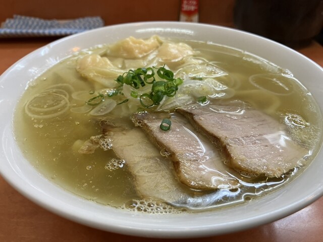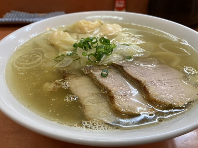 具材は、チャーシュー、海老ワンタン、小口ネギ、青ネギのラインナップ。