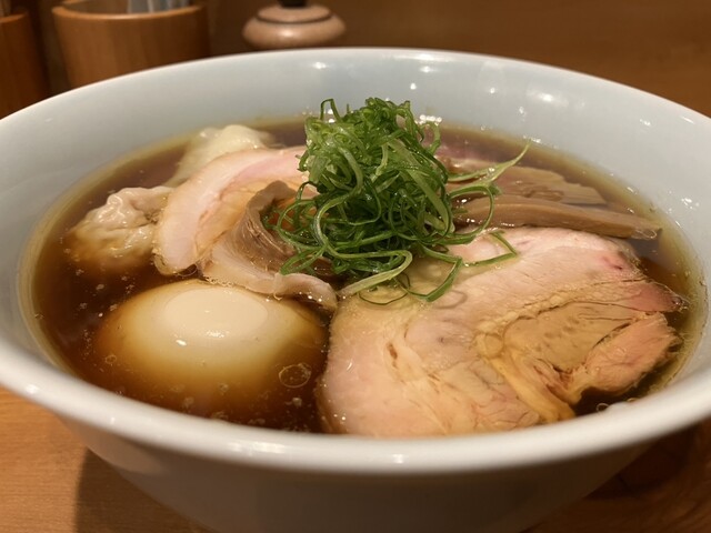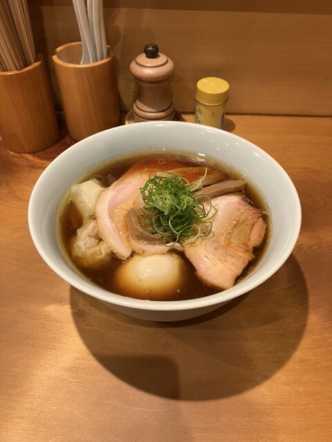 具材は、チャーシュー、ワンタン、味玉、メンマ、九条ねぎのラインナップ。