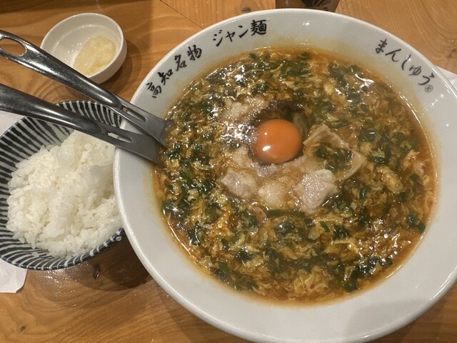 ジャン麺:スープは甘ジョッパイ感じでドロっとしてて卵とじとニラが入っていて穴あきレンゲですくいながら食べるとスープを飲み過ぎないのは良い、ニンニクを追加すると旨さにブーストがかかり生卵をスープの中で崩すのも良し、ご飯にダイブするのも良し