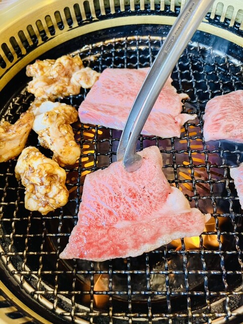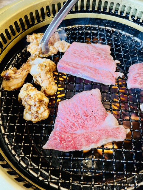 霜降り厚切り肉を焼きながら冷麺いただきます