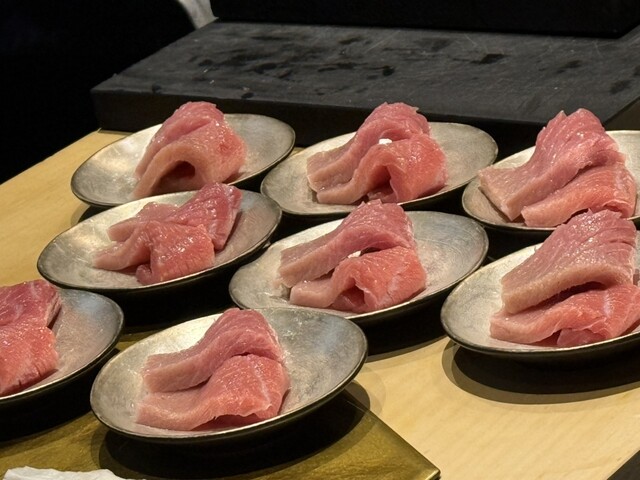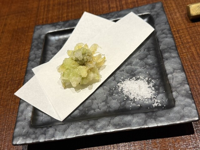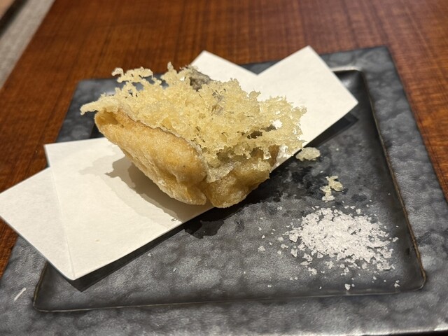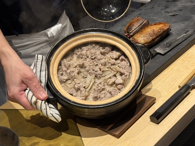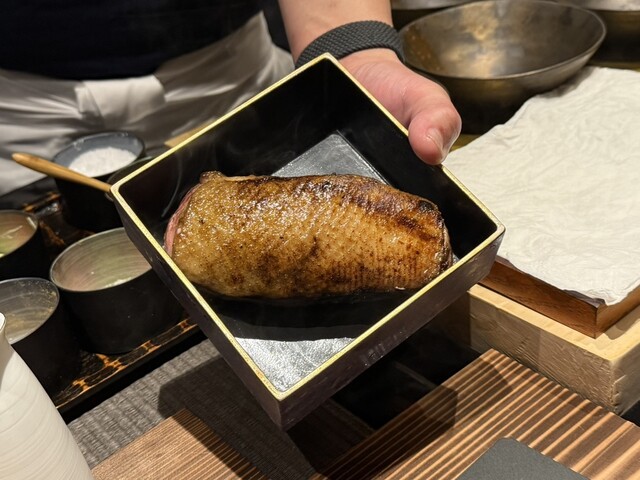 2ヶ月熟成マグロは旨味がぎゅっと濃縮されていて、塩と醤油で食べ比べできるのも楽しいです。天ぷらはふきのとうや白石蓮根、車海老など旬の素材がサクサクふわふわ。油っこさがなく軽やか。鮑のオイル煮はしっとり柔らかく、肝ソースとバターの風味がよく合います。近江鴨の炭火焼きはジューシーで、瞬間燻製の香りが抜群でした。