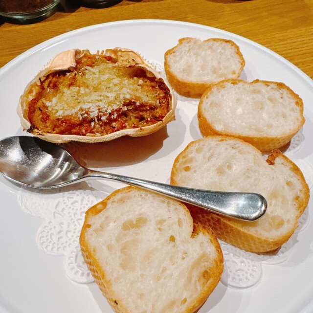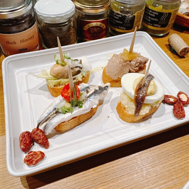 生ハムからはじまり、オリーブ、ピンチョス、カニ、ポテト、煮込み、パエリア、と続いた。