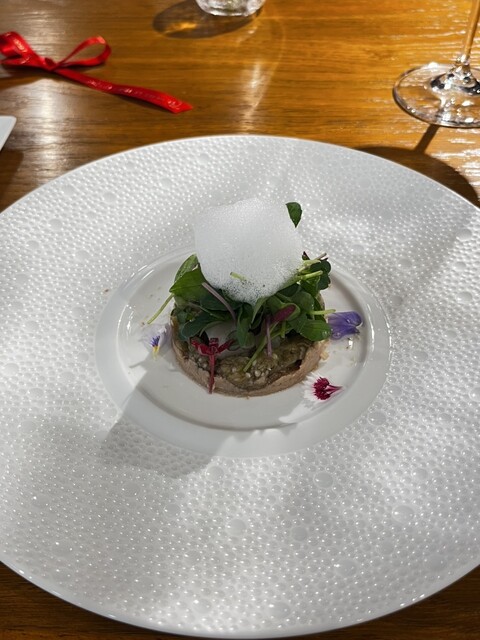 調度品やお皿もすべて銀座時代の店舗から持ってきたという。お皿はリモージュを使用。「ベルナルド」でいちばん有名なシリーズの「エキュム」だと思いますがアミューズと前菜ではあれが出てきました。