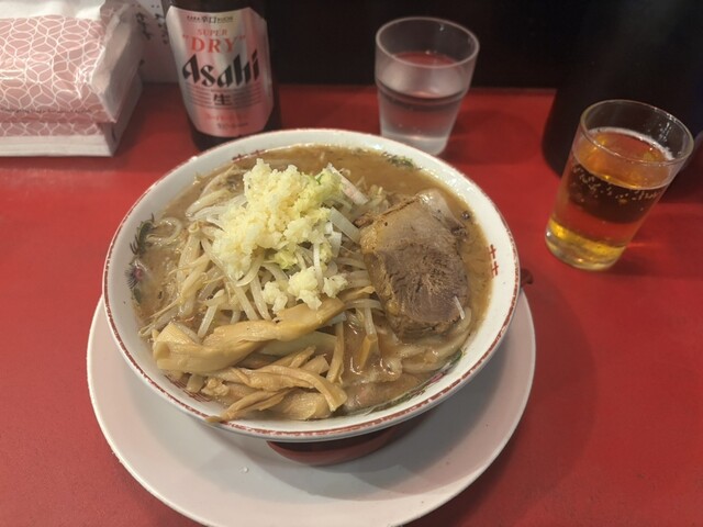 背脂とニンニクとカエシにまみれた炒められた豚とニラと玉ねぎをビールで流し込む。
