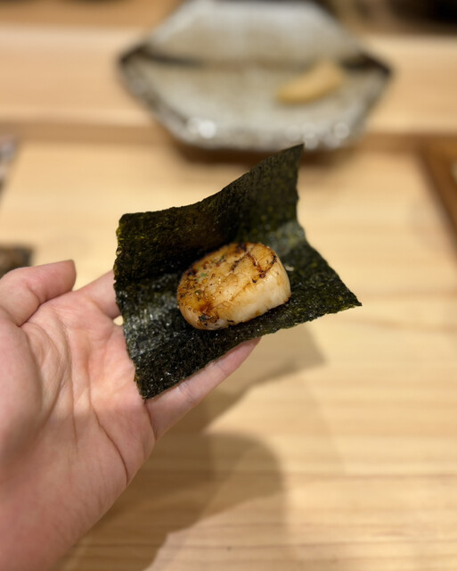 帆立焼きを海苔に包んで食べる。山椒と七味で味付けされており、山椒の風味が良い。