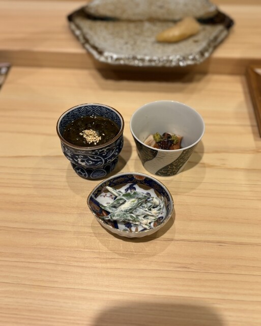 先付けの3品。もずくの酸味がコースのスタートとしてぴったり。そしてタコの桜煮は、びっくりするほどタコが柔らかく煮られている。柚子胡椒が良いアクセント。