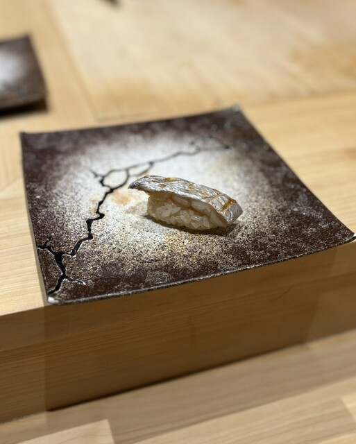 ⑤白子ムースといくら。小皿で圧倒的なインパクトがあった品。タラの白子をムースにしたものに、いくらとシャリ。白子ムースの濃厚な美味しさと、全体のバランスが素晴らしかった。