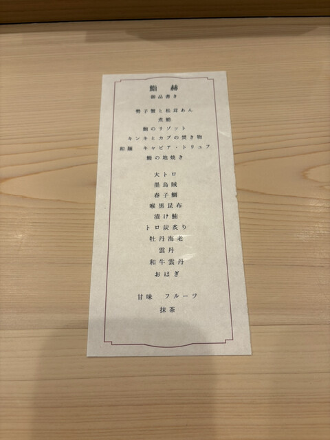 鮨のラインナップ。やはり感動は1巻目の大トロ。口の中でとろける食感と濃厚な旨み。