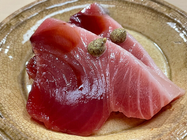 金目の茶碗蒸し、旨いですね〜もみじおろしと浅葱が更に旨さを引き立てています。真魚鰹のこの照り具合、美味さは見た目通りです。