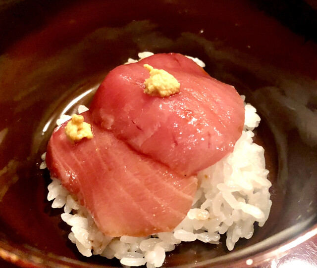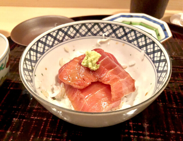 中トロの下には大トロが…少し濃い漬け醤油が美味しい。山芋とカイワレがいいバランスを取っています