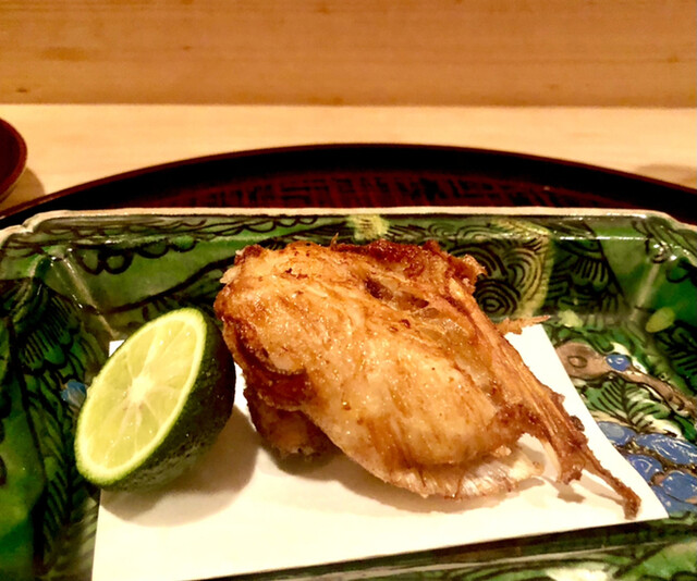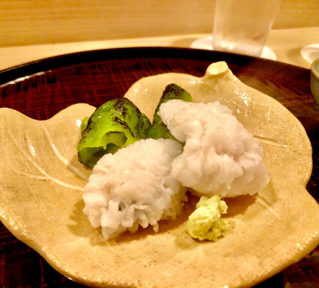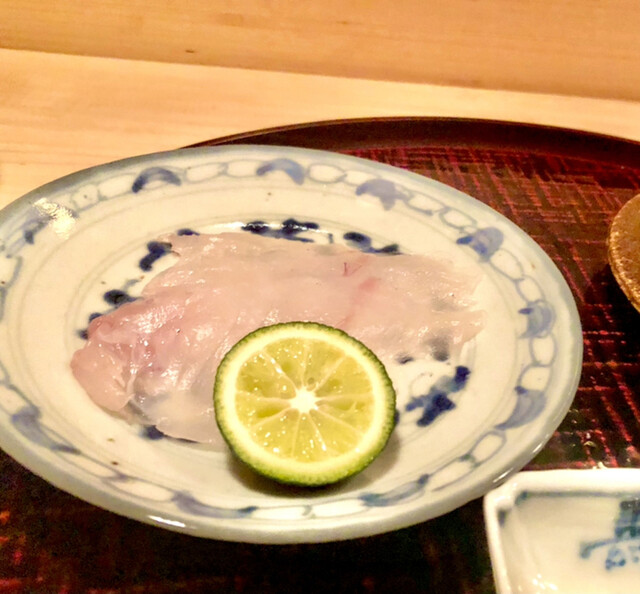 喉黒のタタキ。脂のりが良すぎるくらい 酢橘と山葵で丁度美味しく。