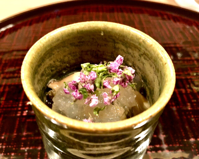煮黒鮑とズンダ、芋茎の吉野葛餡