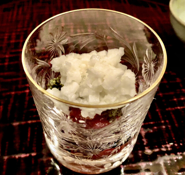 その夜は20時半からのスタートで先ずは蓴菜とオクラの葛寄せに馬糞雲丹をのせた酢の物。