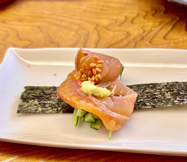 その日は「三重のハタ」から始まり「鰆炙り」「馬糞雲丹パフェ」「閖上赤貝の紐きゅう」とお酒が進む定番メニューが振る舞われます♫