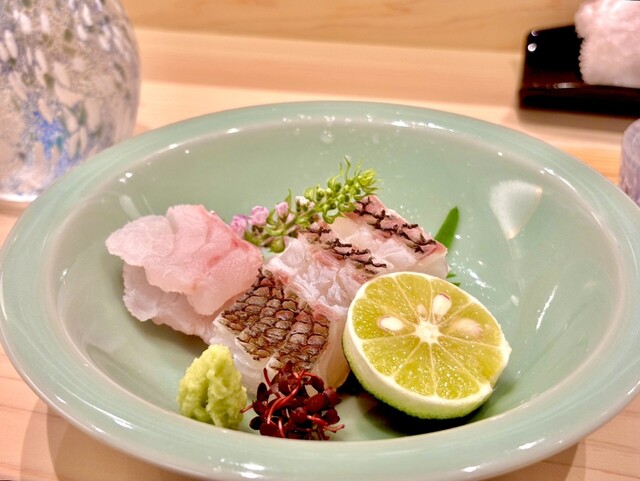 アコウと真鯛の松笠造り スッキリとした蓬莱泉と