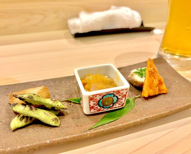 バチコ、焼き茶豆、ウド、コノワタ塩辛、蛸の子など
