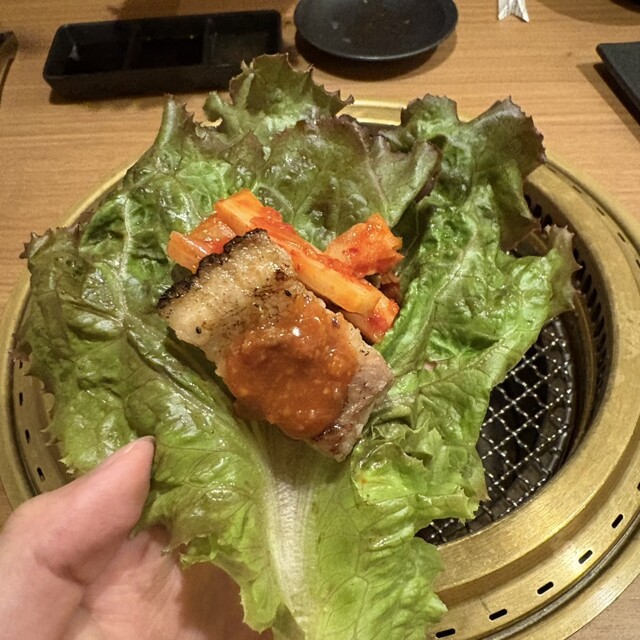 サムギョプサルは肉厚でお野菜に巻いて付けタレとの相性抜群◎