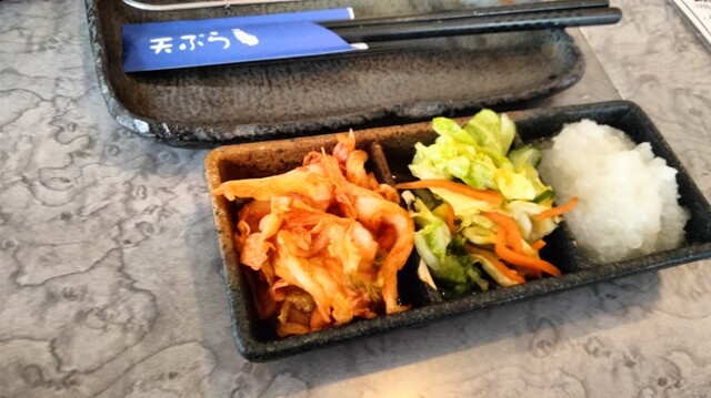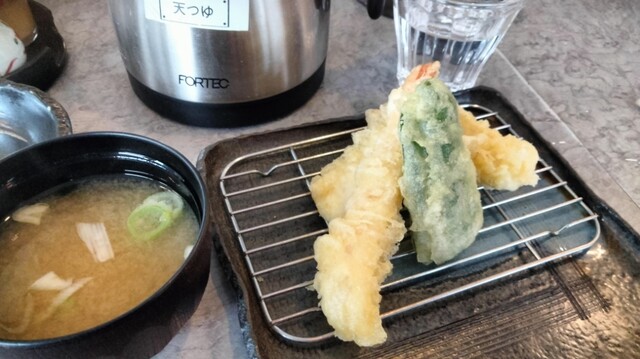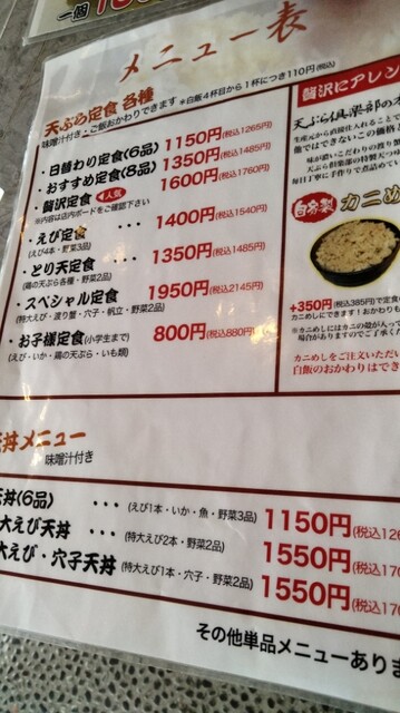 揚げたての海老☓2、イカ、ピーマン、白身魚☓2、じゃがいも、ナスの8種で大満足、かに飯食ったあとは白米☓2、ラストは天丼タレかけて天丼で締め、味噌汁☓2。(笑)