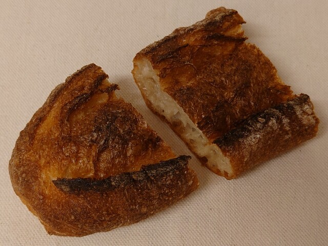 米麹は小麦のデンプンを糖に、たんぱく質をアミノ酸に分解する。米麹を用いない場合に比べ生地中の糖はデンプンから作られた分だけ増えるから、酵母が糖を分解して作る炭酸ガスも増えるだろう。そのためかパンの膨らみを助けるようにクープの長さはBaguetteのそれよりも長いものとなっている。米麹が作り出すアミノ酸は旨味成分であるから、生地全体の旨味は増しているはず。また糖とアミノ酸が生成されるため、メイラード反応が進みクラストの焼き色がBaguetteよりも濃く、少し焼きが進んだ重めの香りがする。この香りが米麹を用いた効果であろう。焼き色の割にクラストは柔らかく、クープが開いたところは薄皮がパリパリと割れるような感じ。なお細く尖った両端は、クラムがほとんど無いので見た目通りのカチカチ状だ。
