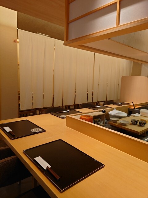 座っているのを目にされたのか、2分ほど早く戸が開き「お待たせいたしました、どうぞ」の声。振り返ると若い板前さんが柔らかい笑顔で暖簾を上げてくれていた。店内へ一歩踏み入れると、汚れ一つないカウンターテーブル、整理整頓が行き届いた調理場、澄んだ空気、そして空間全体に感じられる落ち着き。実に気持ちが良い。「お好きな席へどうぞ」に、いつものようにカウンター端の二席を使わせていただく。
