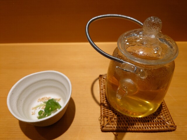 お茶かと思ったガラス器の中身は、なんとたっぷりの出汁!「天ばらの〆に出汁茶漬けにしてどうぞ。スープとして飲まれても美味しいです。」出汁茶漬けは天ばらに直接かけ、スープとして飲む場合は三つ葉と白ごまが入っている湯呑み茶碗に注ぐようだ。これは思いがけず、かなり嬉しい趣向に出会ったものだ。