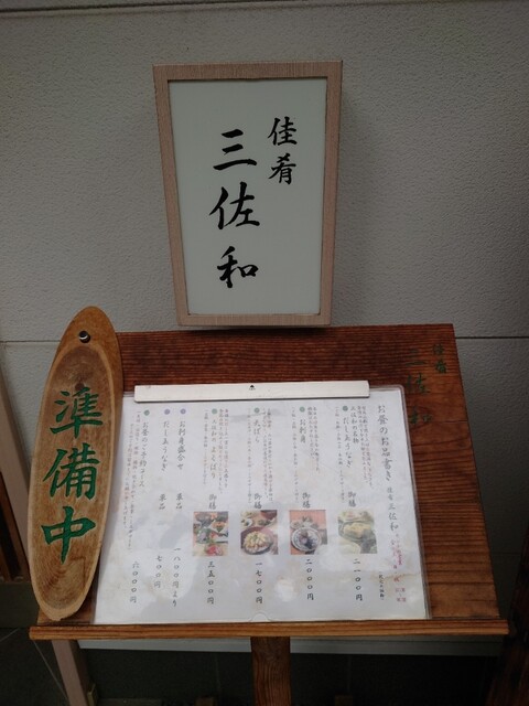 店舗前。横長の窓からは、清潔感に包まれた店内が窺える。メニュー表を見ると、ランチは4種の御膳から。隣に立つ木製ボードに “天ばら丼” と “だし玉うなぎ” と書かれた紙が貼ってある様子から、この二品が三佐和さんの売りだと分かる。だし玉うなぎは単品でも注文できるようなので、天ばら御膳と組み合わせれば二品とも味わえる。