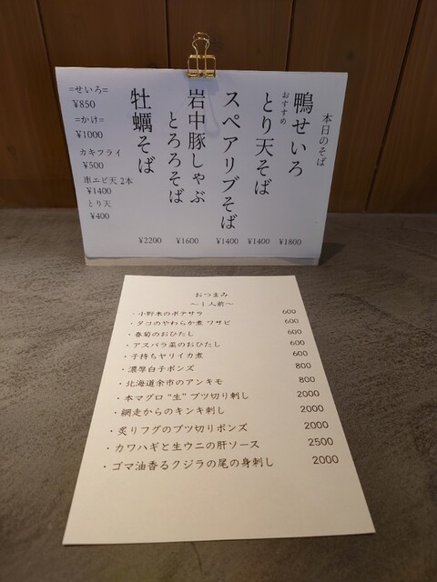 メニューは “本日のお蕎麦” と “おつまみ” に分けられており、どちらも個性が感じられるラインナップとなっている。