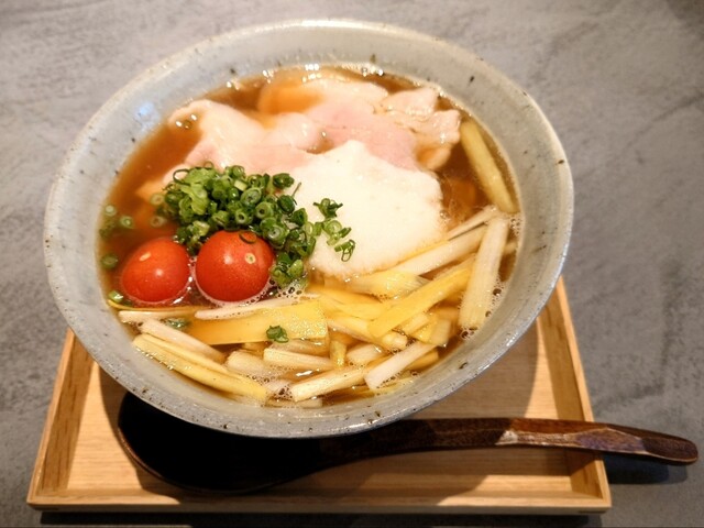 『豊洲から届く新鮮なのどぐろとクエ、名古屋コーチンを3日間煮込みベースの出汁をつくり、蕎麦の香りを引き立てる旨味を抽出。自家製刺身醤油の返しと合わせつゆにしています。』