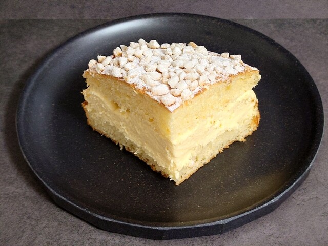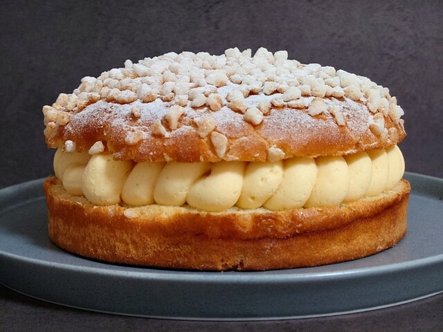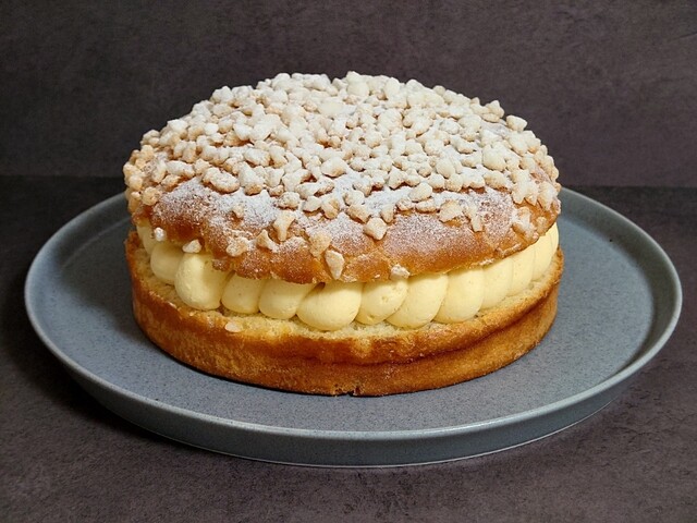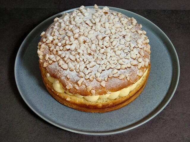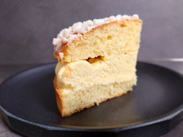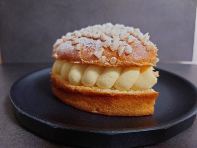 家に着いて箱を開けると、それは美しいトロペジェンヌが現れた。シンプル極まる美とはこのことだろう。程よい焼き色のブリオッシュ生地に挟まれた、淡い黄色のバタークリームからは、内に秘めた品位のようなものが感じられる。そして上面に振りかけられたあられ糖と粉糖も、その簡素な飾り方がかえって上質さを滲み出させている。