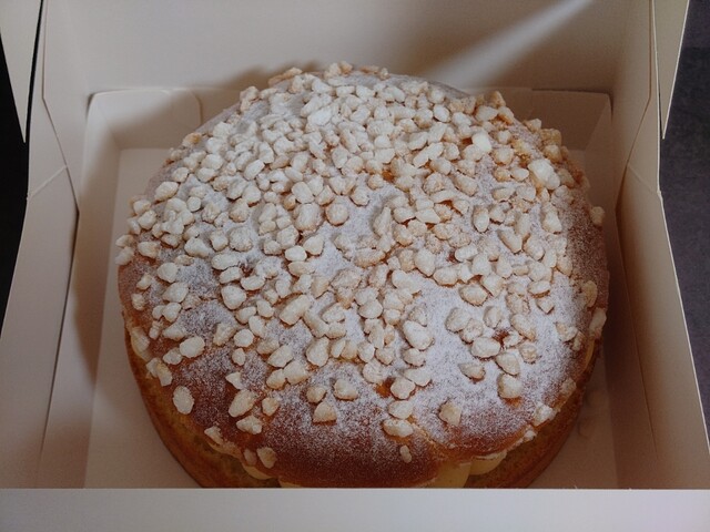 箱を開けると大きなグランド トロペジェンヌ・エシレが現れた。あられ糖と粉糖が上面に振りかけられている。