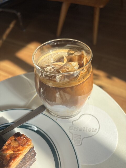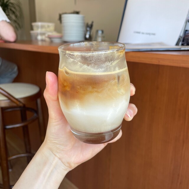ラテ〜!!!!!エスプレッソが濃い!!濃いを超えてキラキラしてる…魅力的すぎるビジュ…グラスも可愛い、、、ちゃんと二層になってるのも魅力的…