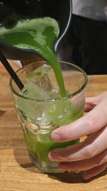 抹茶を目の前で立てて、それをグラスに注いでくれて、贅沢な気分になります。