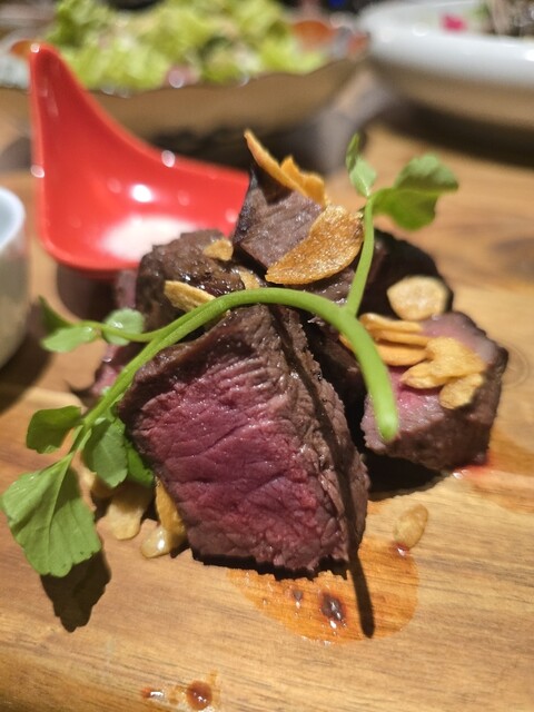赤身の軟らかいお肉に、塩、コショウ、にんにくをつけて、美味しくいただきました。