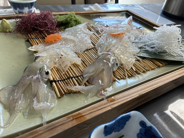 先週のお盆休み中は混んでいて食べるのを諦めたので、今日のランチに再訪問 11:00開店に対して11:30頃に到着したら車も10台程度で、入店後すぐに席に案内されました。 食事後には駐車場も満車に近く待ち時間もあった様です。世間一般の物価上昇の例に漏れずここのメニューも値上がりは否めませんが、やっぱり新鮮なイカの活き造りはこのお店が大好きで今回も満足することができました。