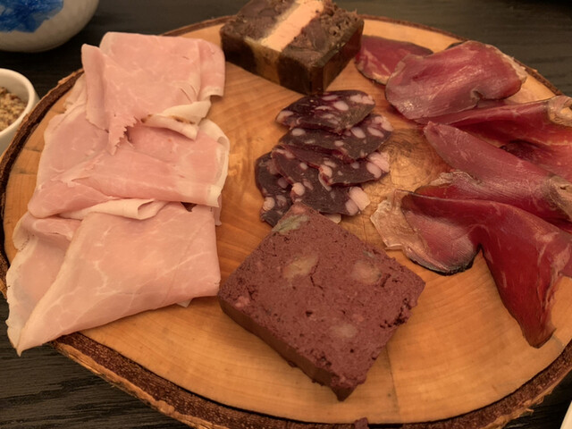 シャルキュトリーと韓国式豚バラ肉のお料理。どちらも良いお味でワインのお供。サービス料や税も入るので、2品で8000円超です。
