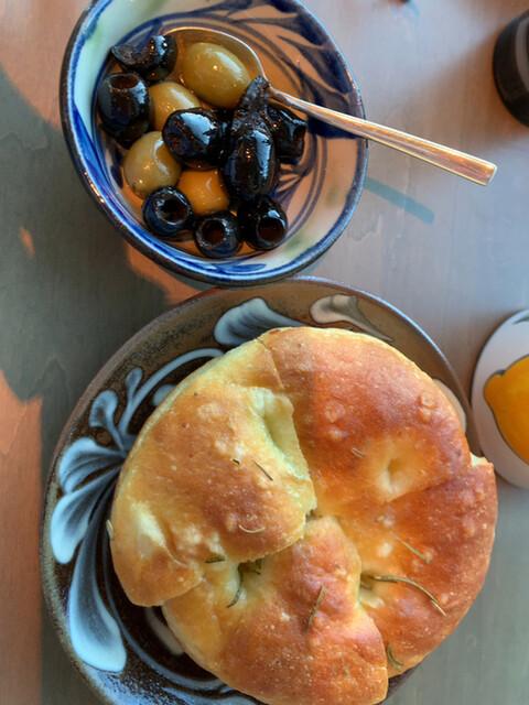焼き立てのフカフカのフォカッチャ。もっぱらお料理のソースをつけて楽しみました。