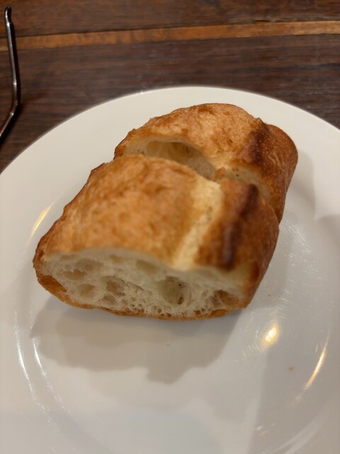 バケットの上にレバームースがこんもりたっぷり。最初に一口食べたらけっこう強いレバー。